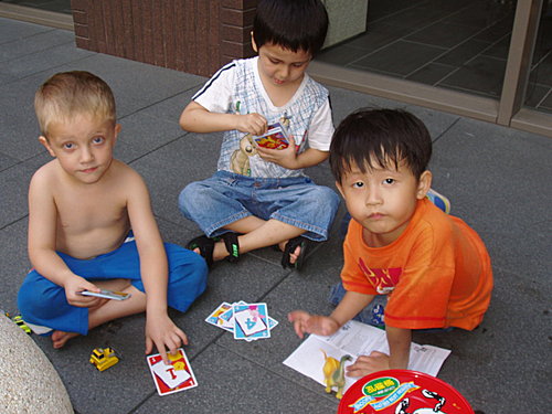 要學好英文一定要多接觸、多使用英文,因此在日常生活中要儘量創造英文接觸的機會。本人的兒子就讀全美幼稚園大班,雖然他已經會用英文來溝通,但我還是儘量找機會讓他多接觸英文,而找一些跟他年紀相仿的外國小孩子跟他一起玩耍,就是最好方法。兒子(圖右) 參加南非籍Thomas (圖中) 的生日party